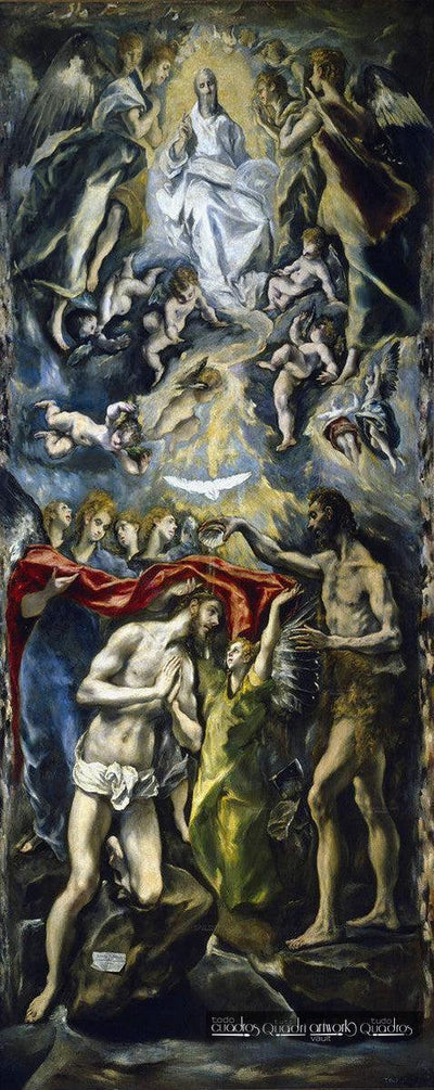 Es zeigt die biblische Szene, in der Johannes der Täufer Jesus im Jordan tauft. Jesus ist mit den für El Greco typischen Merkmalen dargestellt: langgestreckte Körper und etwas kleine Köpfe. Im oberen Teil erscheint der offene Himmel und die weiße Taube, die auf den Messias herabsteigt.