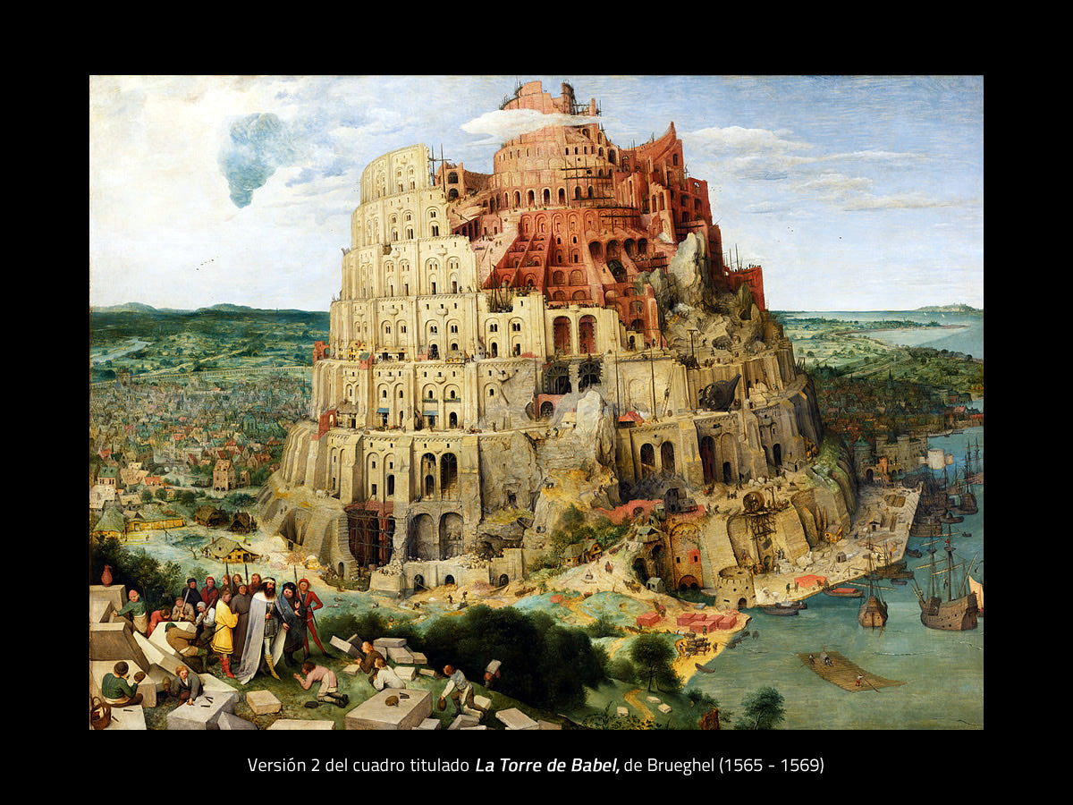 Brueghel schuf zwei Gemälde mit demselben Titel, eines davon (dieses) legt den Schwerpunkt auf ein großes Gebäude der jüdischen Tradition, verlassen und mit düsterer Atmosphäre. Das andere zeigt mit mehr Detail den Bauprozess, mit hellerem Licht und Menschen, Arbeitern und Booten in der Umgebung. Siehe Der Turmbau zu Babel Version 2.